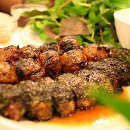 Customers rave about the Large catfish, a must-try dish that is baked or roasted until the skin is crispy, served whole, and topped with oil scallions. Pair it with banh trang (rice paper), fresh veggies, herbs, pickled carrots, and daikon for a complete and satisfying meal. The Bo nuong la lot, seasoned ground beef wrapped in betel leaves, and the Grilled pork dish, sliced and served with fresh romaine lettuce, cucumber, tomatoes, and oil scallions, are also highly recommended by diners.